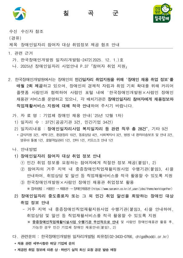 장애인일자리 참여자 대상 취업정보 안내 (2025년 12월 1차) 최고관리자 0 113 2025.12.03 15:01 2025.12.03 15:03 붙임파일 1~6 장애인일자리 참여자 대상 취업정보 안내.zip (1.3M) + 8 장애인일자리 참여자 대상 취업정보 안내 (2025년 12월 1차)
