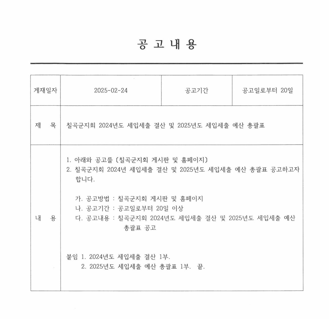 칠곡군지회 2024년도 세입세출 결산 및 2025년도 세입세출 예산 공고 최고관리자 0 365 2025.02.24 17:24 2025.02.26 09:20 2024년도 세입세출 결산.pdf (216.7K) + 15 2025.02.26 09:20 2025년도 세입세출 예산총괄.pdf (213.9K) + 11