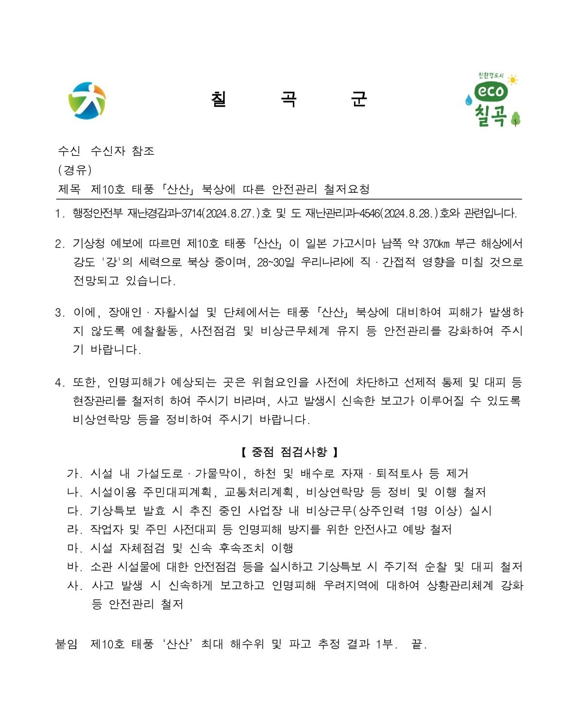 제 10호 태풍 산산 북상에 따른 안전관리 철저 요청 최고관리자 0 431 2024.08.28 16:51 2024.08.28 16:51 제10호 태풍 ‘산산’ 최대 해수위 및 파고 추정 결과08.27. 04시 통보문 기준.hwpx (3.2M) + 17