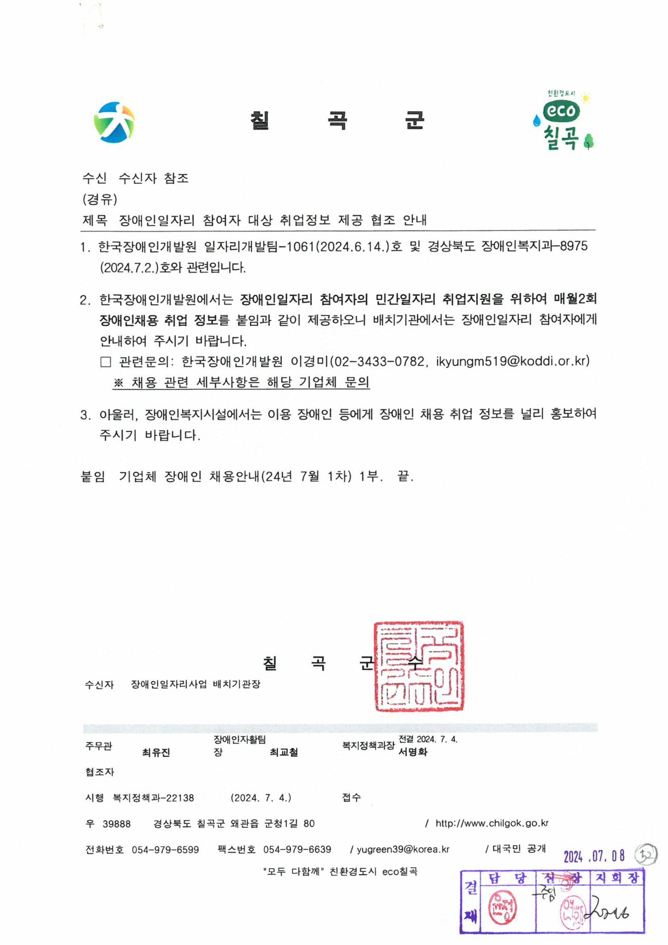 7월 1차 장애인 일자리 참여자 대상 취업정보 제공 안내 최고관리자 0 499 2024.07.12 10:27 2024.07.12 10:27 S22C-6e24071209540.pdf (2.0M) + 10 장애인 일자리 참여자 대상 취업정보 제공 안내한국장애인개발원에서는 장애인일자리 참여자의 민간일자리 취업지원을 위하여 매월 2회 장애인채용 취업 정보를 붙임과 같이 제공합니다.관련 문의 : 한국장애인개발원 이경미(02-3433-0782, ikyungm519@koddi.or.kr) ※ 채용 관련 세부사항은 해다 기업체 문의붙임 기업체 장애인 채용안내(24년 7월 1차) 1부