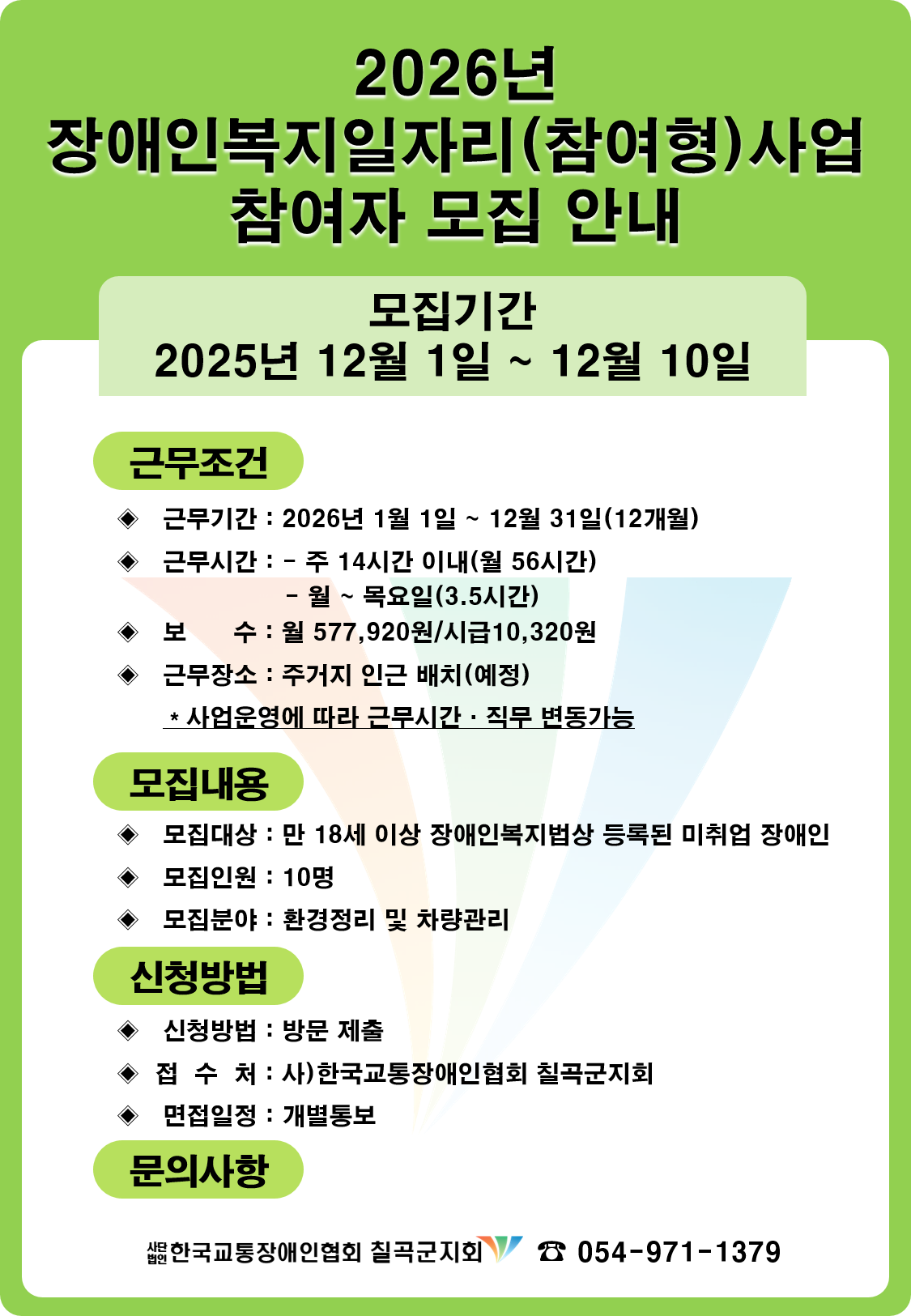 2026년 장애인일자리 (참여형 모집안내) 교통장애인협회 칠곡군지회 제출용 최고관리자 0 162 2025.11.25 10:40 2025.11.25 10:40 1.장애인일자리사업 참여신청서.hwp (77.0K) + 13 2025.11.25 10:40 2.참여자 정보 확인서.hwp (41.5K) + 9 2025.11.25 10:40 3.개인정보 수집이용 및 목적외이용제3자 제공 안내 동의서.hwp (111.0K) + 9