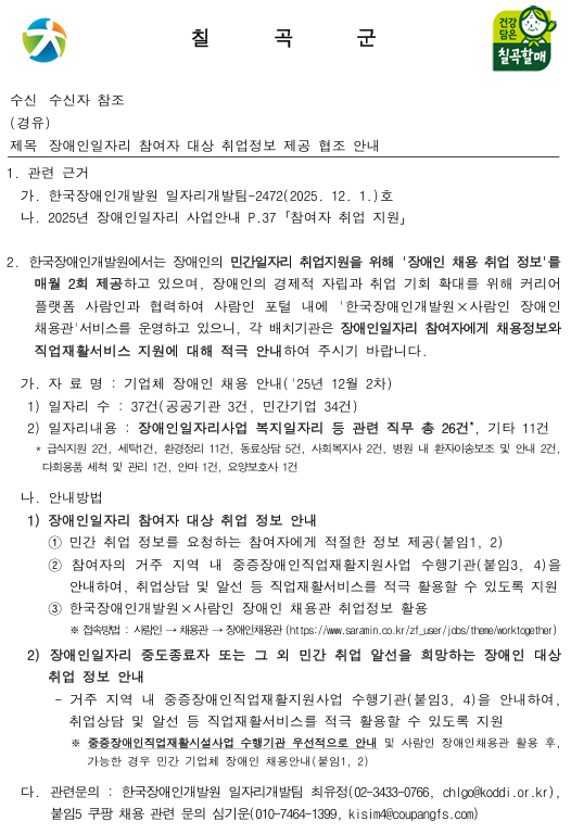 장애인일자리 참여자 대상 취업정보 안내 최고관리자 0 128 2025.12.17 09:35 2025.12.17 09:35 붙임1. 기업체 장애인 채용안내2025년 12월 2차.xlsx (37.6K) + 8 2025.12.17 09:35 붙임2. 기업체 장애인 채용안내2025년 12월 2차.pdf (59.4K) + 11 2025.12.17 09:35 붙임3. 중증장애인직업재활지원사업 안내.pdf (867.5K) + 9 2025.12.17 09:35 붙임4. 2025년 중증장애인 직업재활지원사업 수행기관 목록2025.11.14. 기준.xlsx (26.2K) + 7 2025.12.17 09:35 붙임5. 쿠팡풀필먼트서비스 FC물류센터 모집정보.xlsx (19.9K) + 8