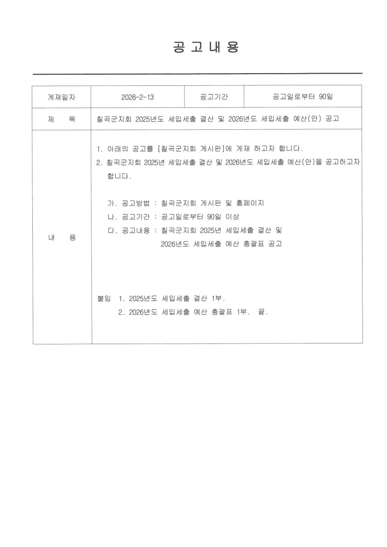 칠곡군지회 2025년도 세입세출 결산 및 2026년도 세입세출 예산 공고 최고관리자 0 49 02.13 14:18 칠곡군지회 2025년도 세입세출 결산 및 2026년도 세입세출 예산(안)칠곡군교통약자이동지원센터 2025년도 세입세출 예결산