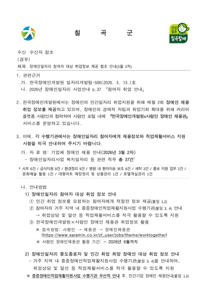 장애인일자리 참여자 대상 취업정보제공(3월2차) 최고관리자 0 41 03.16 09:28 2026.03.16 09:28 붙임1. 기업체 장애인 채용안내2026년 3월 2차.xlsx (31.4K) + 3 2026.03.16 09:28 붙임2. 기업체 장애인 채용안내2026년 3월 2차.pdf (179.5K) + 3 2026.03.16 09:28 붙임3. 중증장애인직업재활지원사업 안내.pdf (867.5K) + 3 2026.03.16 09:28 붙임4. 2026년 중증장애인 직업재활지원사업 수행기관 목록2026.2.5. 기준.xlsx (26.0K) + 2