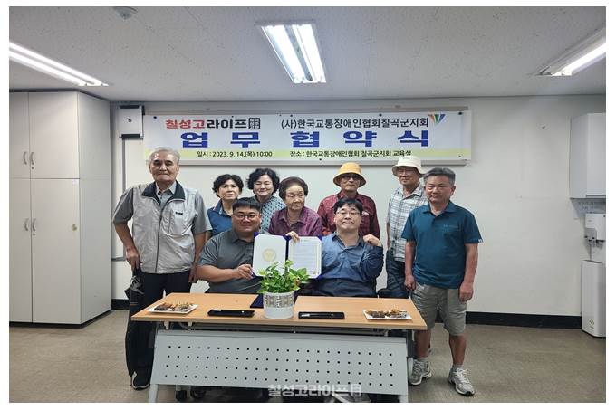 (사)한국교통장애인협회 칠곡군지회(지회장 정재성)와 인터넷뉴스 칠성고라이프(대표 장윤혁)가 칠곡군의 장애인복지증진과 다양 한 사회 공익활동을 목적으로 상호 긴밀한 협력을 위해 9월 14일 업무협약(MOU)를 체결했다.