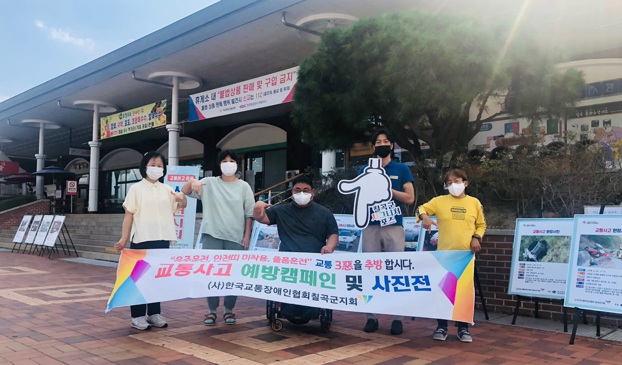 사진전시회 및 교통안전 캠페인을 개최하였으며 칠곡군 시그니처 홍보활동도 함께 진행 최고관리자 0 590 2022.08.09 14:22 사)한국교통장애인협회 칠곡군지회는 휴가철 늘어나는 교통사고를 예방하고자 칠곡휴게소 (부산방향 8월 4일(목)~5일(금))에서 비대면 사진전시회 및 교통안전 캠페인을 개최하였으며 칠곡군 시그니처 홍보활동도 함께 진행 하였다.