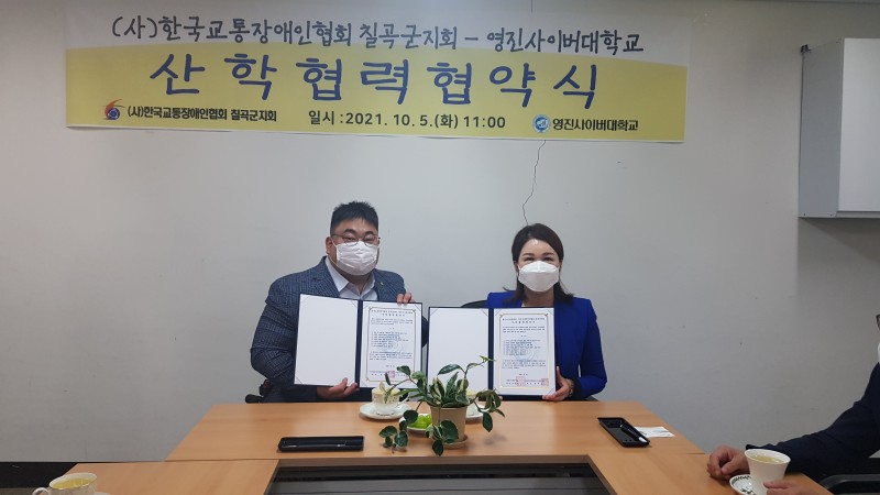 (사)한국교통장애인협회 칠곡군지회(지회장 정재성)는 영진사이버대학교(총장 조방제)와 10월 5일 교통장애인협회 칠곡군지회 교육실에서 산학 업무협약을 통한 지역산업과 교육 분야의 상호발전을 도모하기 위한 협약서를 체결했다.
