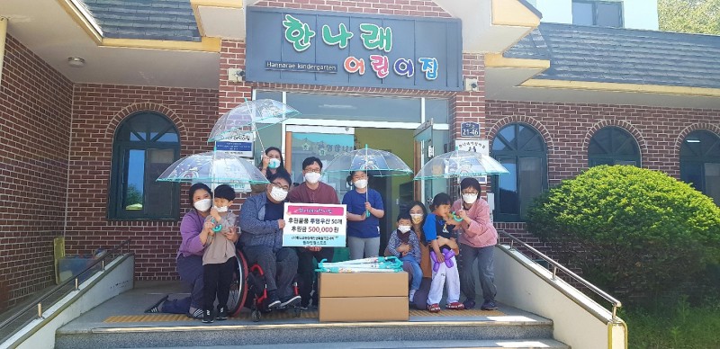 이에 한나래어린이집 장재경 원장은 “코로나시대 불경기에도 불구하고 어린이에 관심을 가져줘서 고맙고, 교통사고에 취약한 장애 아동들에게 교통사고 예방에 도움이 되는 투명우산을 전달 할 수 있어 너무나 감사하다”고 전했다.