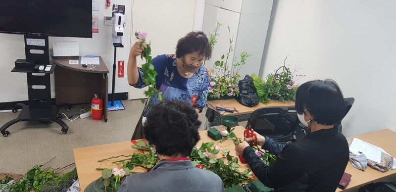 장애인역량강화 교육 - 꽃꽃이수업 최고관리자 0 582 2021.06.09 15:43 장애인역량강화 기능경기대회 교육 2021년 장애인의 역량강화를 위해 경북장애인기능경기대회에 참여하기로 했다분야는 한복, 미술, 웹마스터, 컴퓨터 활용능력, 화훼이다. 교통장애인협회 칠곡군지회에는 참여를 신청한 회원분들에게 최대한의 역량을 발휘 할 수 있도록 지원하기로 했다. 첫번째 지원으로는 화훼분야이며 강사님을 초빙하여 6월3일부터 시작해서 6월24일 매주 목요일 16:00~18:00에 진행하기로 하였다.6월3일 첫 수업으로는 핸드타입과 수직형 꽃꽃이 연습을 하였다.