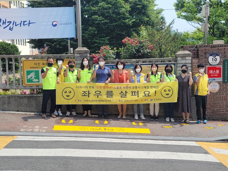 날씨가 많이 무더움에도 불구하고 (사)한국교통장애인협회 칠곡군지회 회원 분들과 인평초등학교 교장, 교감, 담담선생님을 비롯해 인평초등학교 녹색어머니회의 적극적인 참여로 인해 노란발자국을 안전하게 설치하였다.