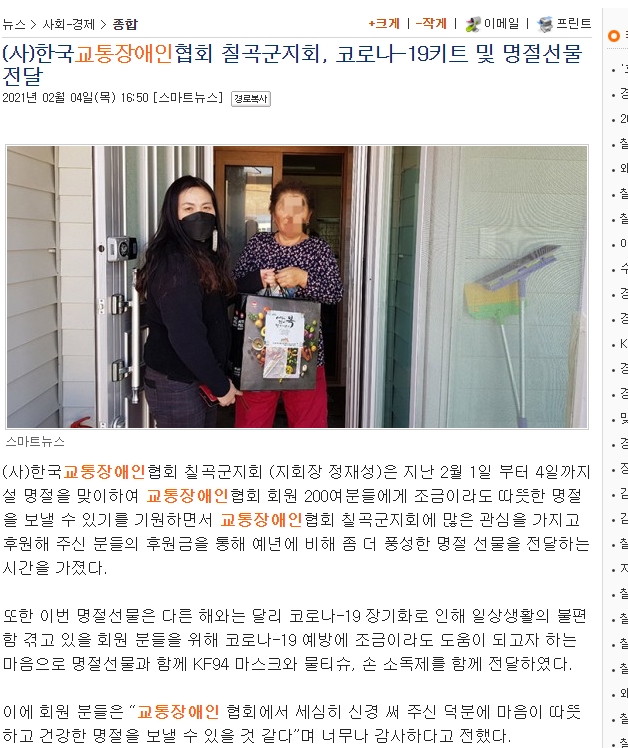 (사)한국교통장애인협회 칠곡군지회, 코로나-19키트 및 명절선물 전달 최고관리자 0 554 2021.03.18 10:10 원문 주소http://www.ismartnews.com/default/index_view_page.php?idx=40633&search_order=%B1%B3%C5%EB%C0%E5%BE%D6%C0%CE