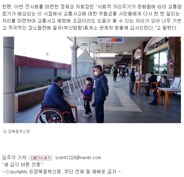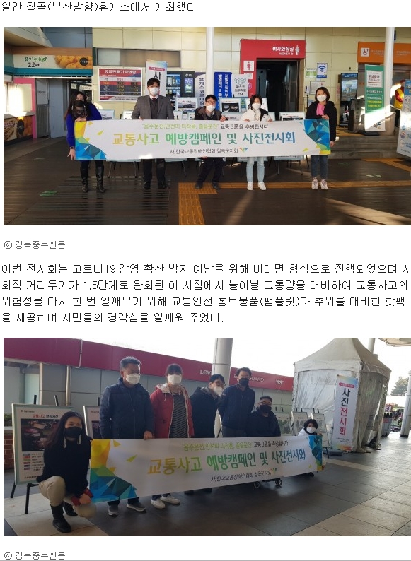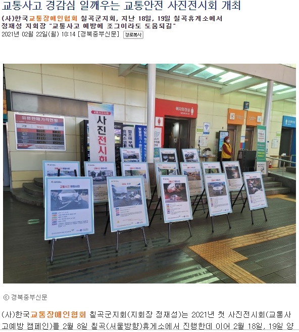 교통사고 경감심 일깨우는 교통안전 사진전시회 개최 최고관리자 0 813 2021.03.18 10:18 원문 주소http://www.jbinews.com/default/index_view_page.php?board_data=aWR4JTNEODYxODYlMjZzdGFydFBhZ2UlM0QwJTI2bGlzdE5vJTNEMzEyJTI2dG90YWxMaXN0JTNEMzEy||&search_items=cGFydF9pZHglM0Q3JTI2c2VhcmNoX29yZGVyJTNEJUIxJUIzJUM1JUVCJUMwJUU1JUJFJUQ2JUMwJUNFJUM3JUY5JUM4JUI4||