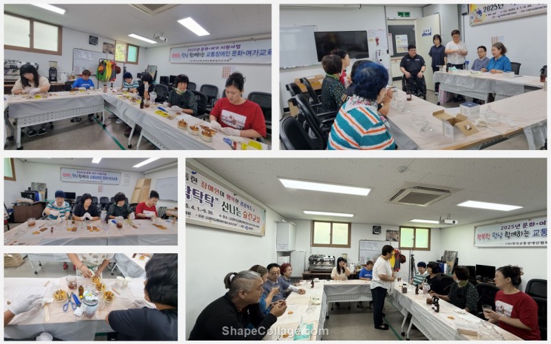 문화여가지원사업 향기캔들 만들기 수업 최고관리자 0 162 2025.08.18 11:40 2025년 8월 14일 문화여가지원사업 향기캔들 만들기 수업목적 : 교통장애인의 문화 여가 지원으로 생활의 여유와 활력 충전대상 : 회원 및 교통사고 장애인장소 : 칠곡군지회 교육장일시 : 2025년 8월 14일 (사)한국교통장애인협회 칠곡군지회는 2025년 8월 14일 문화여가지원사업의 일환으로 향기캔들 만들기 수업을 진행하였다.이날 수업은 참여인원 10명 으로 회원 및 교통사고 장애인의 생활의 여유와 활력을 충전 하였다.