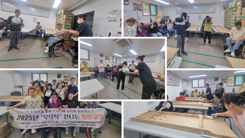 2025년 20회차 장애인 생활체육 슐런교실 실시 최고관리자 0 133 2025.09.22 15:05 2025년 20회차 장애인 생활체육 슐런교실 실시목적 : 교통장애인의 체육활동과 생활의활력 충전대상 : 회원 및 교통사고 장애인장소 : 칠곡군지회 교육장일시 : 2025년 9월 15일(사)한국교통장애인협회 칠곡군지회는 2025년 9월 15일 20회차 장애인 생활체육 슐런교실 실시하였다.이날은 생활체육 슐런교실 마지막 회차로 슐런교실 참여자들과 함께 대회 형식으로 진행하여 순위별로 선물을 지급하고 다과도 같이 하였다. 생활체육 슐런교실은 4월 부터 9월 까지 총 20회기로 구성하였다.