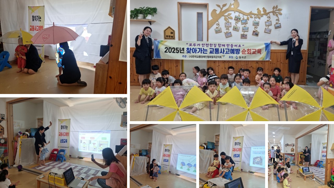 초록나무 어린이집에서 '찾아가는 교통사고예방 순회교육' 실시 최고관리자 0 340 2025.06.20 09:32 초록나무 어린이집에서 '찾아가는 교통사고예방 순회교육' 실시목적 : 교통사고 예방 및 안전교육 대상 : 유치원생 장소 : 초록나무 어린이집 일시 : 2025년 6월 19일(사)한국교통장애인협회 칠곡군 지회는 2025년 6월 19일 교통사고 예방을 위하여 초록나무 어린이집에서 '찾아가는 교통사고예방 순회교육' 실시