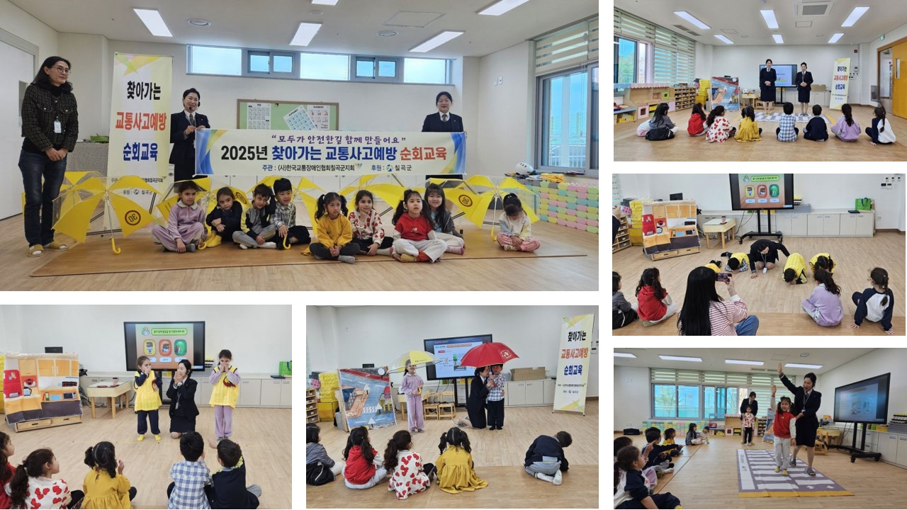 왜관중앙초등학교병설유치원에서 '찾아가는 교통사고예방 순회교육' 실시 최고관리자 0 251 2025.04.17 16:14 왜관중앙초등학교병설유치원에서 '찾아가는 교통사고예방 순회교육' 실시목적 : 어린이 교통사고 예방 및 안전교육 대상 : 유치원생장소 : 왜관중앙초등학교병설유치원일시 : 2025년 4월 17일(사)한국교통장애인협회 칠곡군 지회는 2025년 4월 17일 교통사고 예방을 위하여 왜관중앙초등학교병설유치원에서 '찾아가는 교통사고예방 순회교육' 실시