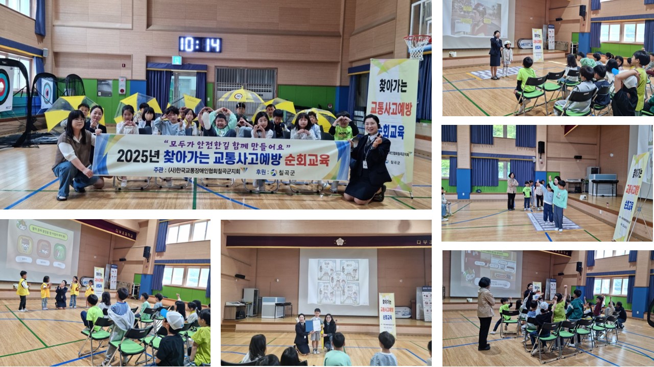 다부초등학교에서 '찾아가는 교통사고예방 순회교육' 실시 최고관리자 0 224 2025.05.09 13:40 다부초등학교에서 '찾아가는 교통사고예방 순회교육' 실시목적 : 어린이 교통사고 예방 및 안전교육 대상 : 다부초등학교 학생장소 : 다부초등학교일시 : 2025년 5월 8일(사)한국교통장애인협회 칠곡군 지회는 2025년 5월 8일 교통사고 예방을 위하여 다부초등학교에서 '찾아가는 교통사고예방 순회교육' 실시