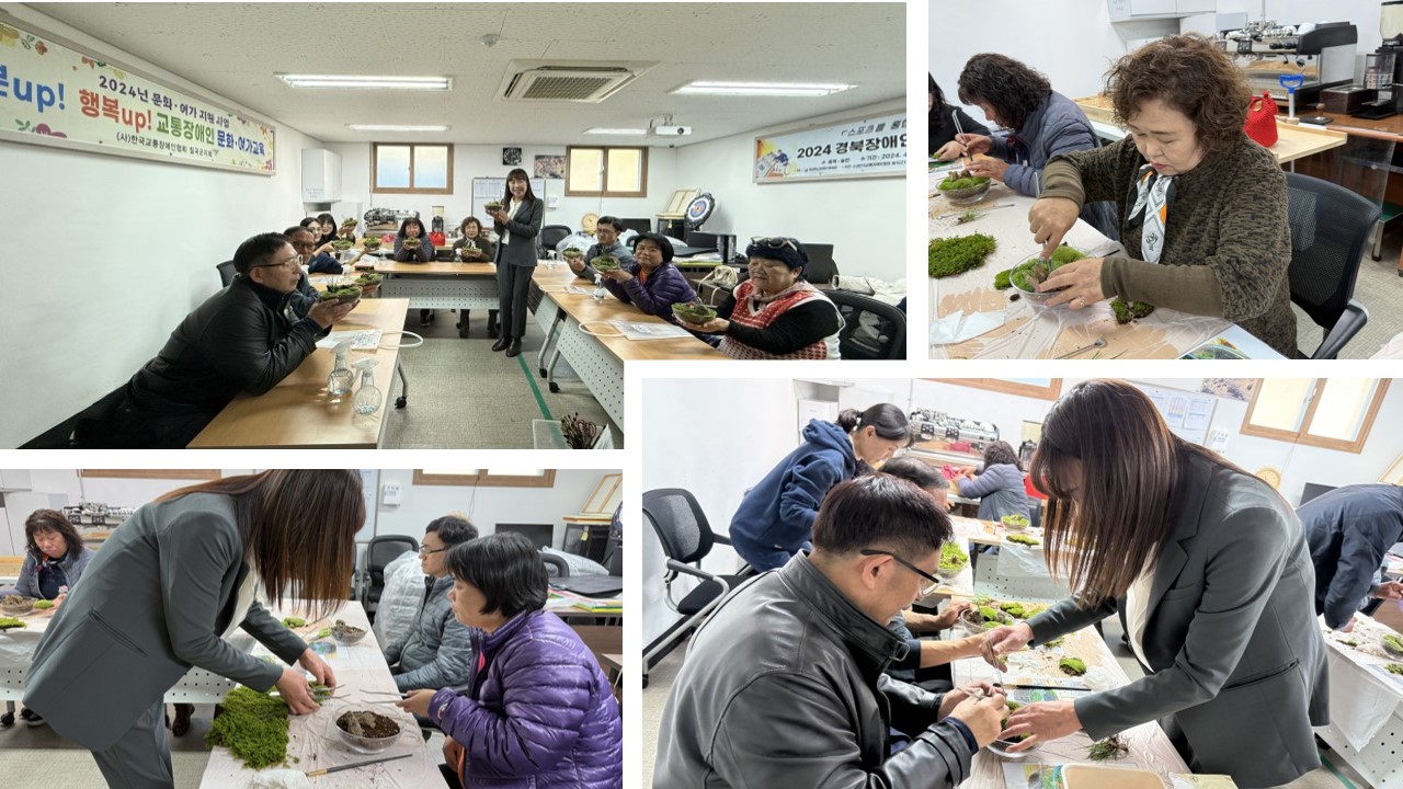 2024년 11월 22일 문화여가지원사업 이끼공예 만들기 수업 최고관리자 0 350 2024.11.22 15:49 2024년 11월 22일 문화여가지원사업 이끼공예 만들기 수업목적 : 교통장애인의 문화 여가 지원으로 생활의 여유와 활력 충전대상 : 회원 및 교통사고 장애인장소 : 칠곡군지회 교육장일시 : 2024년 11월 22일 (사)한국교통장애인협회 칠곡군지회는 2024년 11월 22일 문화여가지원사업의 일환으로 이끼공예 만들기 수업을 진행하였다.이날 수업은 참여인원 10명 으로 회원 및 교통사고 장애인의 생활의 여유와 활력을 충전 하였다.