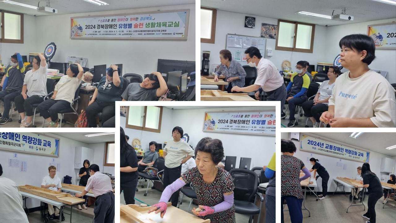 2024년 19회차 장애인 생활체육 슐런교실 최고관리자 0 351 2024.08.13 09:27 (사)한국교통장애인협회 칠곡군지회 2024년 8월 12일 19회차 장애인 생활체육 슐런교실 실시